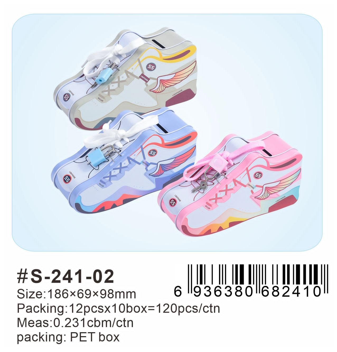Functional Utility: Beyond aesthetics, the slot on top confirms their role as coin banks, encouraging savings in a fun way. The addition of a small padlock attached to the laces enhances their utility, signaling secure storage for coins or small valuables.