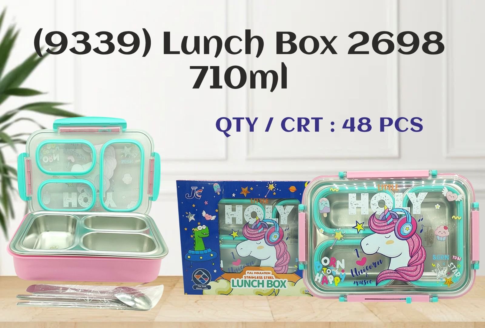 Brighten mealtime with the Three‑Layer HOLY Unicorn Lunch Box, designed to combine practicality with playful charm. Featuring a sturdy pink base and a transparent lid with turquoise edges, this lunch box showcases a cheerful unicorn motif with fun text accents. Inside, three stainless steel compartments keep food fresh, organized, and separated, making it ideal for balanced meals. The secure clips ensure spill‑free portability, while the included utensils (spoon, fork, and knife) add convenience for school, office, or travel. Durable, easy to clean, and delightfully designed, the HOLY Lunch Box is perfect for kids and adults who want functionality with a touch of fun.