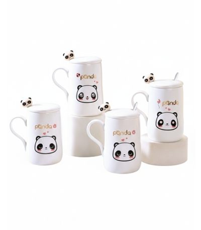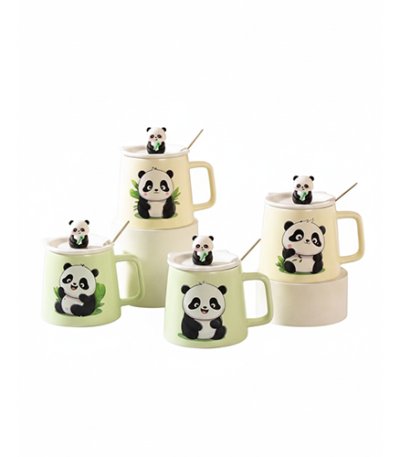A complete ceramic mug set with panda design, including a matching lid and spoon for convenience.