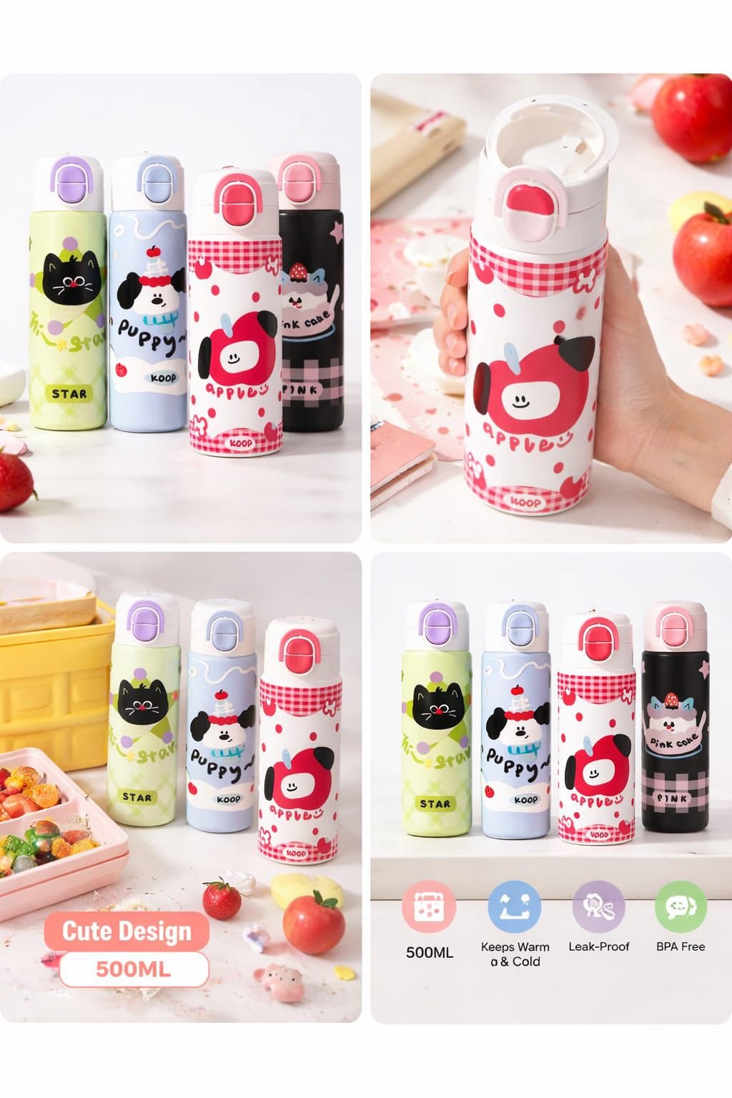 The Star Double Use Bottle (450ml) is designed to make hydration fun, practical, and reliable. Featuring cheerful cartoon-inspired designs with playful puppy and cat motifs, this bottle is perfect for kids, teens, or anyone who loves cute aesthetics. Its smart double-use design allows you to sip directly with the sipper or remove it for classic flask-style drinking. Built with durable stainless steel and double-wall insulation, it keeps beverages hot or cold for hours. Compact and lightweight at 450ml, it’s easy to carry for school, office, or travel. With vibrant colors, flip-top lids, and secure closure, the Star bottle combines everyday functionality with delightful style.